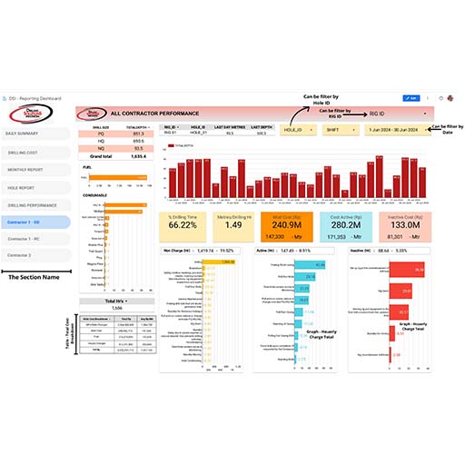 The DSI Dashboard is available to our clients nominated staff, this is updated on a daily basis, the dashboard allows us to breakdown all information including costs on a rig x rig, shift x shift, hole x hole basis and individuel mud product costs and quantities.We can program / modify the dashboard to suit any drilling program to get the desired results to ensure quality tracking and drilling success.