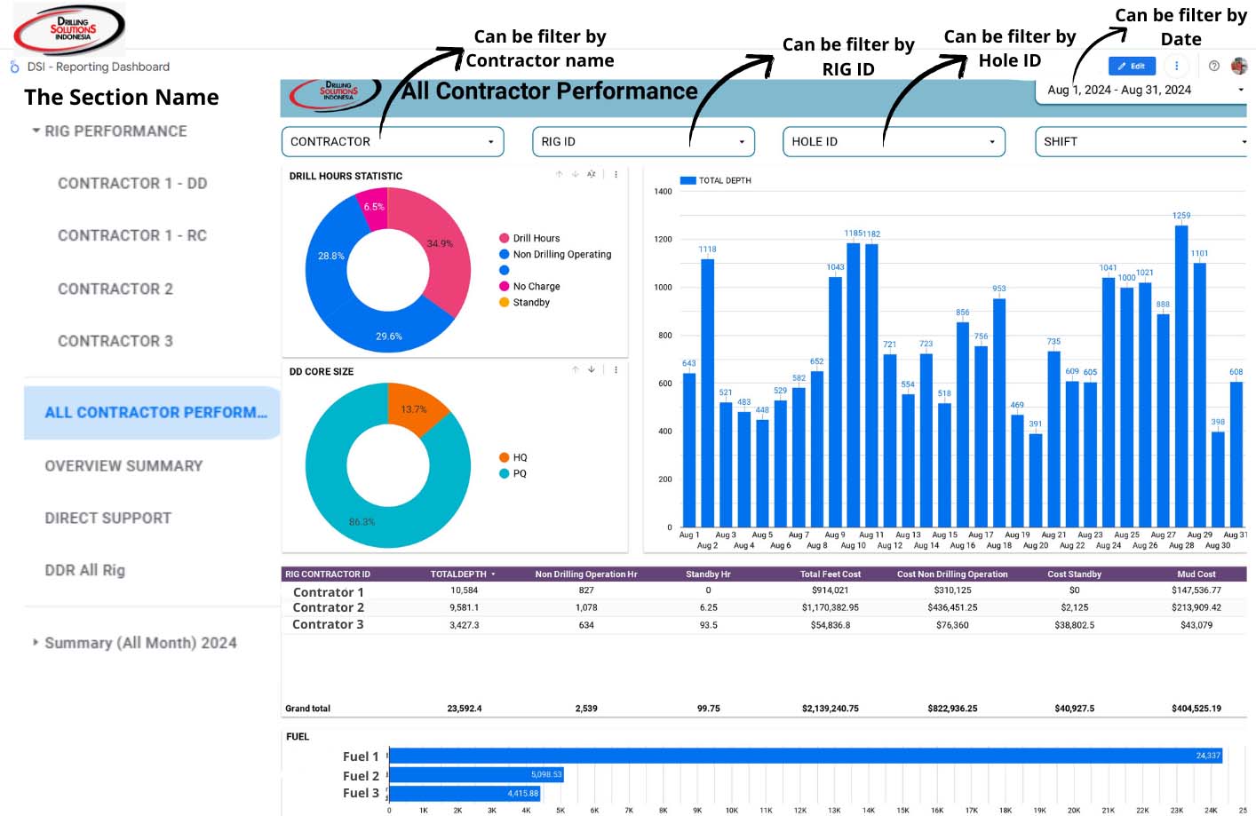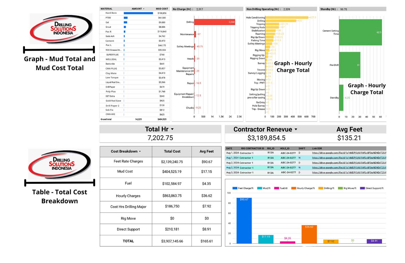 The Drilling Solutions Indonesia Dashboard is designed to track production, monitor costs, manage mud products and mud costs, monitor all drilling and chargeable hours, track core recovery and most importantly identify any problems and take appropriate action on a daily basis.